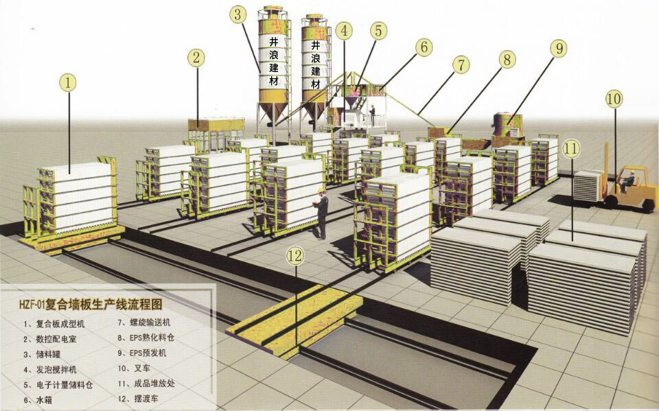 井浪轻质复合墙板生产线:高速装模--改良搅拌--自动振捣--养护--机械拆模--包装--入库--出库--运输。